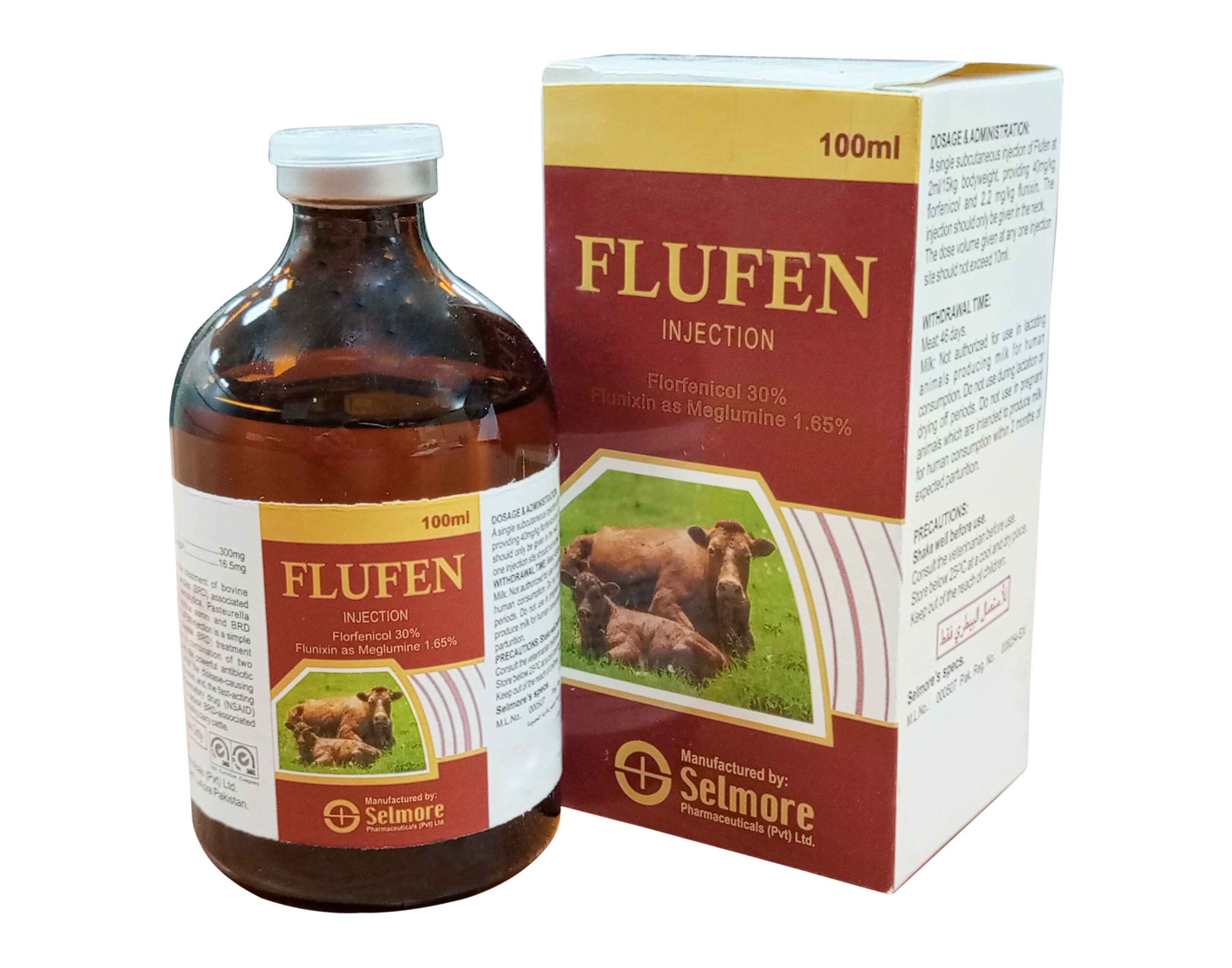 It is indicated for the treatment of bovine respiratory disease complex (BRD) associated with Mannheimia haemolytica, Pasteurella multocida and Histophilus somni and BRD associated pyrexia.FLUFEN injection is a simple bovine respiratory disease (BRD) treatment strategy. It involves a combination of two therapies in one dose: the powerful antibiotic florfenicol to kill or inhibit the disease- causing bacteria Mycoplasma bovis; and, the fast-acting non-steroidal anti-inflammatory drug (NSAID) Flunixin meglumine to reduce BRD-associated fever in beef and non-lactating dairy cattle.