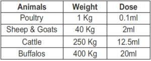 Cattle/Buffalo/Sheep/Goat: 10mg per kg body weight.